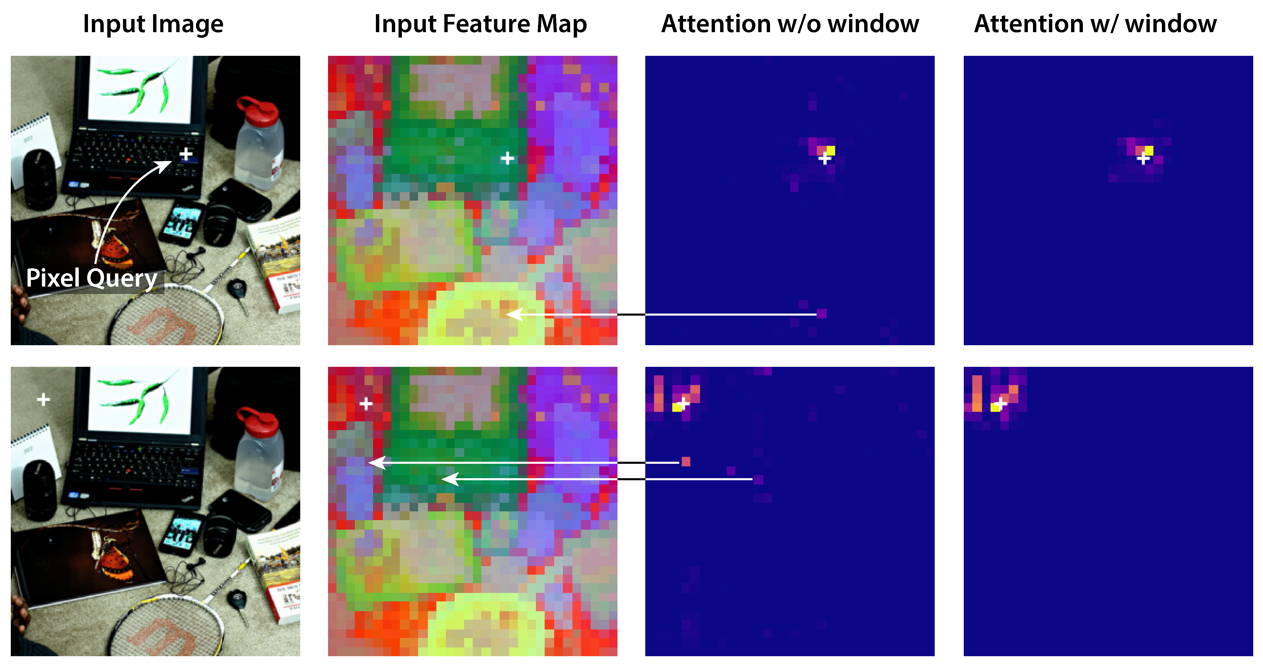 Given an RGB image $I_{hr} \in \mathbb{R}^{H \times W \times 3}$ and coarse encoder features $p \in \mathbb{R}^{h \times w \times c}$, AnyUp predicts high-resolution features $q = f(p, I_{hr}) \in \mathbb{R}^{H \times W \times c}$ suitable for pixel-level tasks. We build a lightweight window attention-based upsampler: image pixels provide queries; keys combine downsampled image features and coarse features; values are the coarse feature patches. Two changes make this architecture encoder-agnostic and more accurate.