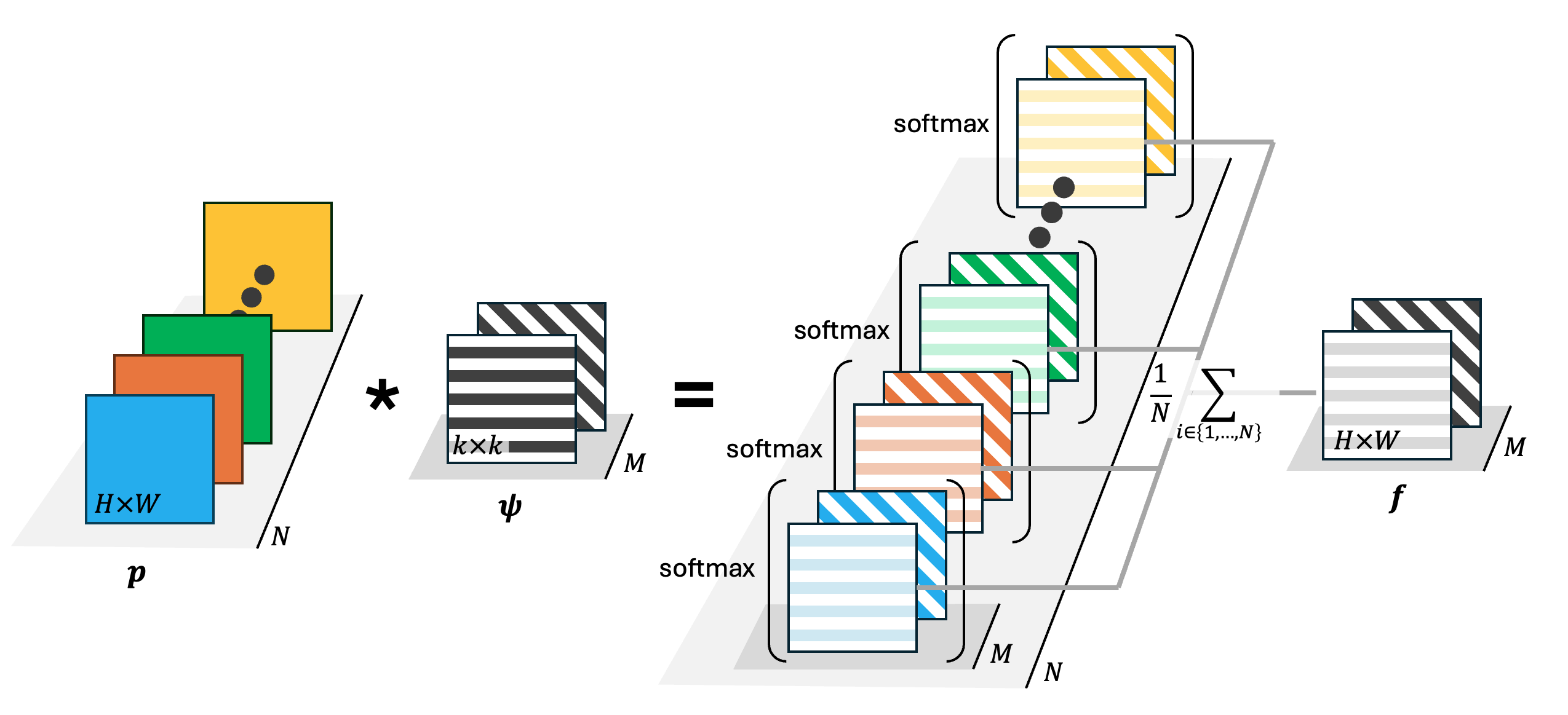 channel is convolved with a learned filter basis; per-filter responses are softmax-normalized and averaged across