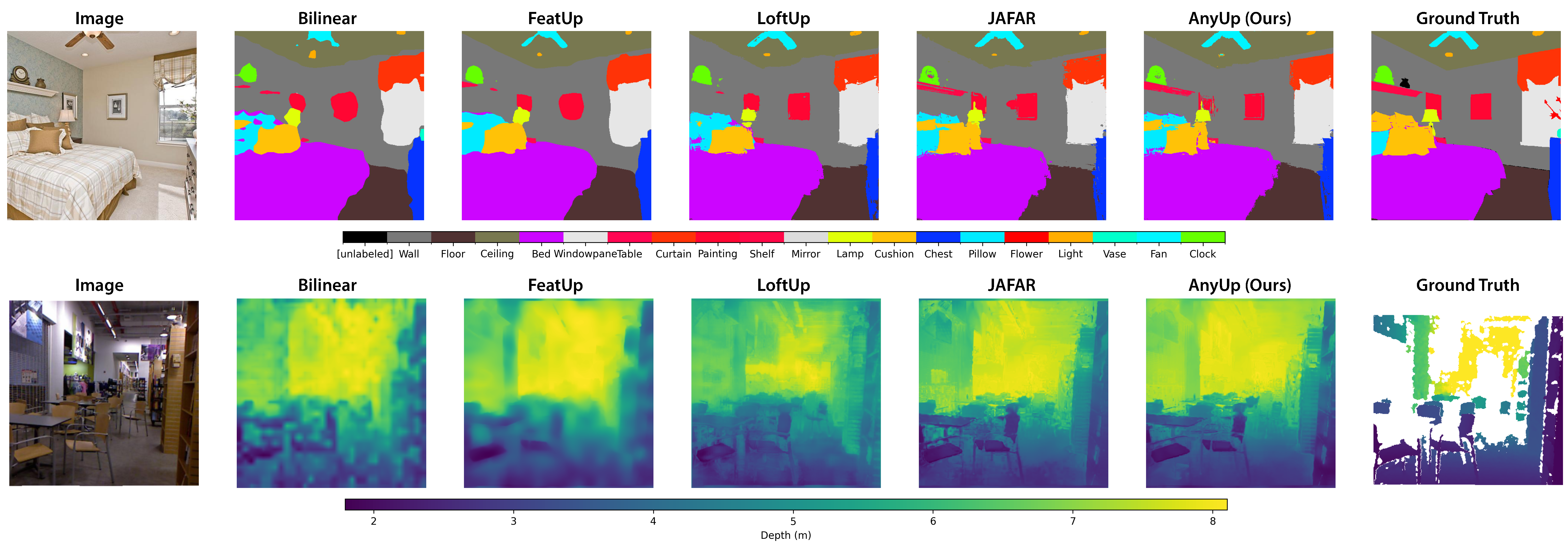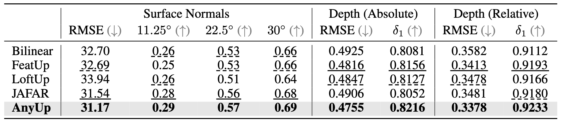 Following previous works, we evaluate the upsampled features using linear probing for semantic segmentation, monocular depth, and surface normal estimation. As prior upsamplers are limited to specific backbones, we compare AnyUp to them on the DINOv2 (ViT-S) backbone, for which all prior methods have models available. We find that AnyUp outperforms all prior specialized methods on these tasks.