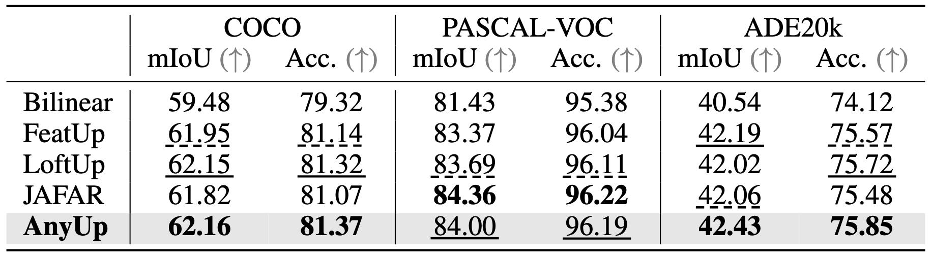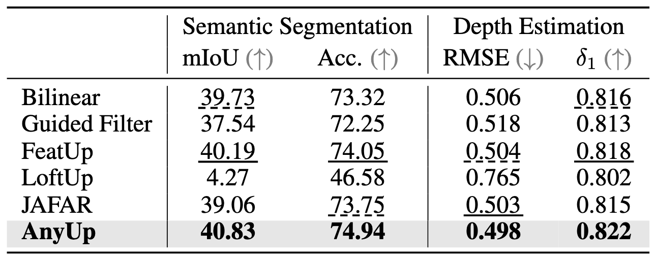 Quantitative Results. AnyUp outperforms all prior methods when performing linear probing on semantic segmentation, monocular depth, and surface normal estimation when using DINOv2 features. Best results per column are in bold.