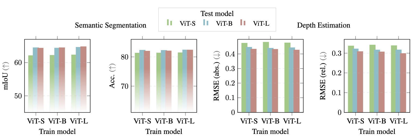 Generalization Results. AnyUp trained on DINOv2 (ViT-S) generalizes well to other model sizes (left) and families (right).