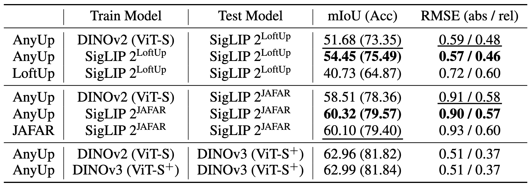 We test encoder-agnostic upsampling by training AnyUp once on DINOv2 (ViT-S) and applying it unchanged to features from different encoders and model sizes. See the teaser video for a qualitative impression. AnyUp matches or surpasses encoder-specific upsamplers on SigLIP 2 and transfers well to DINOv3. Across sizes, the expected linear-probe trend (ViT-L $\geq$ ViT-B $\geq$ ViT-S) holds regardless of the training backbone used for AnyUp.